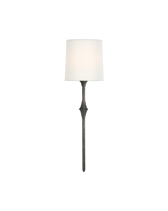 Den eleganta Dauphine vägglampan i åldrat järn är designad av Visual Comfort och ger en tidlös touch till ditt hem. Lampan har en höjd på 48,3 cm, bredd på 14 cm och förlängning på 11,4 cm, vilket gör den lämplig för olika rum och ytor.
