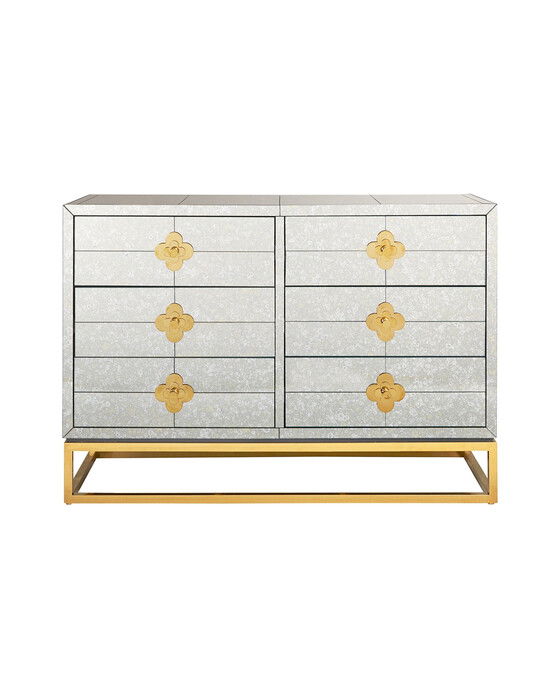 Delphine är en elegant byrå från Jonathan Adler där minimalistiska former möter maximalistisk glamour. Skåpet är tillverkat av antikt spegelglas och har ben och detaljer i fin polerad mässing. Byrån har sex utdragbara lådor med en turkos interiör. Delphines quatrefoil-handtag omringade av sköldar i mässing ger en dekorativ elegans till byråns annars enkla form.