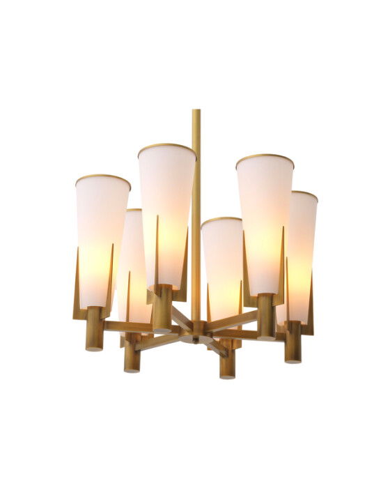 Dino taklampa i mässing kombinerar en gotisk design med en modern känsla. denna taklampa är unik med sin mässingsfinish och två vita glasskärmar med detaljer i mässing.