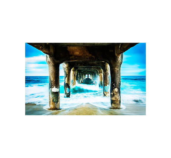 Den här tavlan från Cobra Art fångar en hypnotisk vy under en brygga där havet möter horisonten. De väderbitna pelarna leder blicken mot en oändlig punkt, medan det mjuka ljuset och de blå tonerna skapar en drömlik och lugnande atmosfär. De brusande vågorna ger en känsla av rörelse och frihet, vilket gör detta konstverk till en perfekt detalj för att skapa en harmonisk och inspirerande miljö i ditt hem.