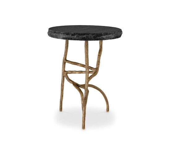 Det eleganta Dreyfus sidobordet i antik mässing har en vintage-finish och en unik marmorskiva med ojämna kanter. Varje bord är ett unikt konstverk tack vare de tydliga variationerna i färg och ådring. Det handskurna mönstret på de gjutna mässingsbenen ger en extra touch av elegans och naturlig skönhet till varje rum.