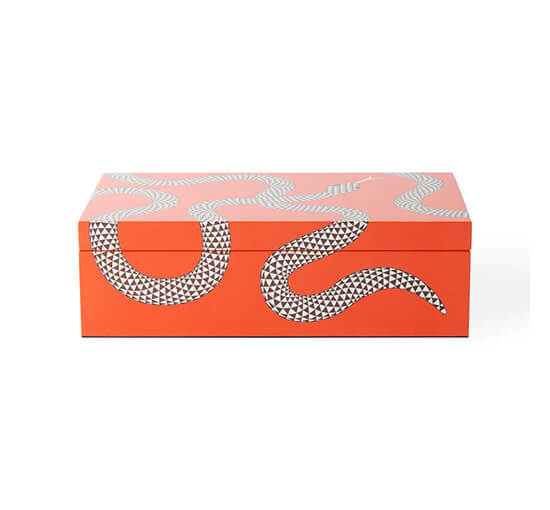 • Högblank yta i vallmo-orange färg med dekorativt mönstrad orm