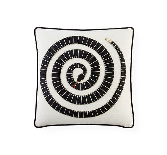 Ge din soffa, fåtölj eller säng en känsla av modern lyx med Eden Coil kudden från Jonathan Adler. Kudden är dekorerad med en handbroderad orm som är en av Adlers signaturer. Den är broderad på en linnebas och har en vacker svart passpoal som ramar in motivet.