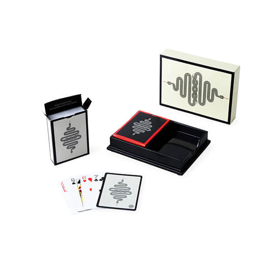 Ge dina spelkvällar en extra touch av glamour med dessa dekorativa kortlekar från Jonathan Adler. Setet består av två stycken kortlekar, utsmyckade med en illustration av slingrande ormar, och en högblank dekorativ ask att förvara dem i.
