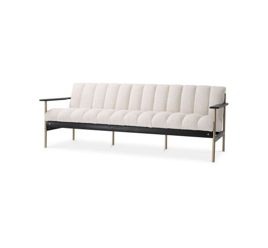 Elan soffan är en fyllig men ändå raffinerad möbel som kombinerar ultimat komfort med eleganta proportioner. Med en stomme i borstad mässing och armstöd i svart trä, ger denna soffa en modern touch till ditt hem. Sitsen och ryggstödet är stoppade i Bouclé cream och har djupa kanalsömmar för extra stöd.
