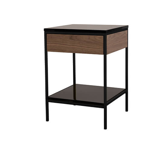 Erin sidobord från Ruth & Johanna i en elegant och praktisk design med utdragbar låda. Bordet är tillverkat av en spännande materialmix av marmorskivor, låda av valnötsfanér och benställning av rostfritt stål med svart finish. Perfekt att placera bredvid din soffa eller som ett sängbord i sovrummet.