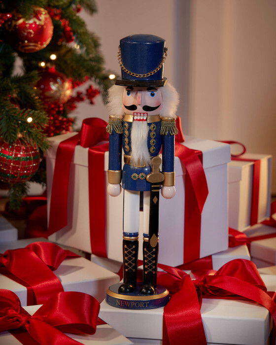 Erland nötknäpparen är en klassisk juldekoration från Newport, tillverkad av trä och mäter hela 38 cm. Den är inrett i blått och vitt med guldiga detaljer, vilket ger den en elegant och traditionell look. Perfekt att placera intill julgranen eller på en hylla för att skapa en festlig atmosfär. Den levereras i en exklusiv presentförpackning för säker förvaring och hållbarhet mellan säsongerna.