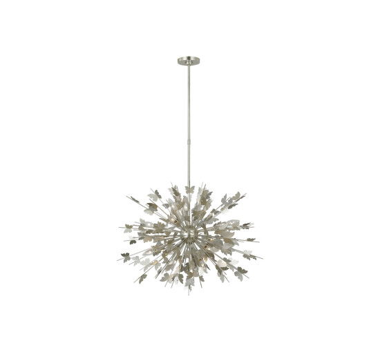 Farfalle takkrona i silver med fjärilsmotiv skapad av Julie Neill. Upplysta fjärilar i guld eller silver samlas energiskt till en lekfull ljuskrona som passar perfekt i vardagsrum, matsalar, sovrum, entréer och kök.