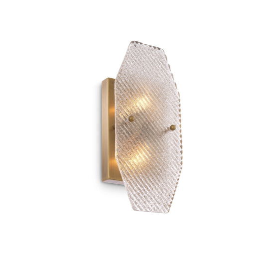 Den eleganta vägglampan Fernando har en fyrkantig bas i antik mässing som är fäst vid en åttkantig ribbad glasplatta. Med sitt moderna utseende ger den en dramatisk touch till vilken vägg som helst och löser belysningsbehov på ett sofistikerat sätt.