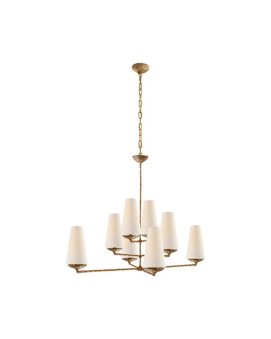 Fontaine från AERIN är en takkrona som kombinerar estetiken från mitten av århundradet med en modern touch. Den är tillverkad med skulpterat metallarbete i flera utsökta utföranden, vilket gör den perfekt för att förhöja mindre utrymmen eller skapa en elegant fokuspunkt i en större matsal eller vardagsrum. De koniska linneskärmarna ger vackra linjer och varm belysning, oavsett om de sitter på en vägglampa eller en ljuskrona.