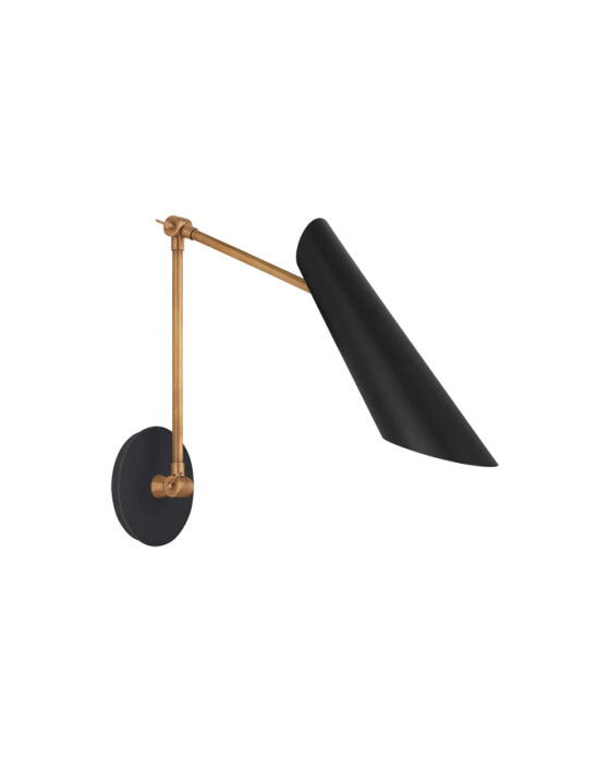 Den moderna och elegant designade Franca vägglampa dubbel i antik mässing/svart från AERIN är en perfekt kombination av mitten av århundrade charm och nutida stil. Med sina justerbart ljuskronor och koniska skärmar i svart eller vitt, ger denna lampa en enastående fokuspunkt i vilket rum som helst.