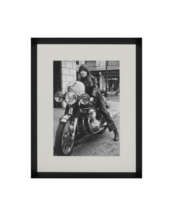 Det svartvita fotot av Françoise Hardy fångar hennes ikoniska status inom både musik och mode, med en känsla av cool elegans och ungdomlig frihet som speglar det tidstypiska 60-talets anda.
