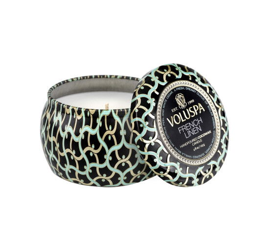 Ett lyxigt doftljus från Voluspa som sprider en fräsch doftkombination av bomullsblomma, bärnsten, soltorkad vaniljböna, citrusskal och vit ceder. Ljuset är gjort av kokosvax och brinner med en klar låga, vilket ger en lång brinntid på 25 timmar. Levereras i en vacker plåtburk med dekorativt mönster i mörka färger.