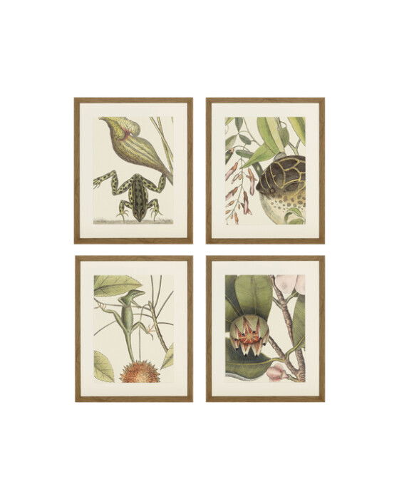 Detta set består av fyra tavlor i måtten 45 x 45 cm, med klassiska illustrationer av groda, blåsfisk, ödla och balsamträd. Motiven är inspirerade av historiska naturstudier och förenar vetenskaplig detaljrikedom med konstnärlig elegans. Ett unikt inslag som för in naturens skönhet i hemmet.