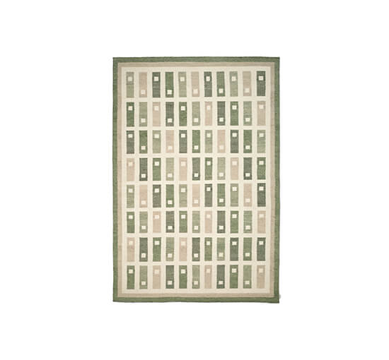Handvävd i röllakansteknik och skapad inom kollektionen Arv, bjuder denna matta på ett återkommande blockmönster inspirerat av svensk textiltradition. Det grafiska uttrycket mjukas upp av dämpade toner i skogsgrönt, salvia och sand som skapar en harmonisk helhet. Den flatvävda konstruktionen gör mattan vändbar, lättplacerad och smidig under möbler. Ullen är naturligt slitstark och smutsavvisande och utvecklar med tiden en vackert matt yta. Små variationer i väv och färgton vittnar om det genuina hantverket bakom varje exemplar.