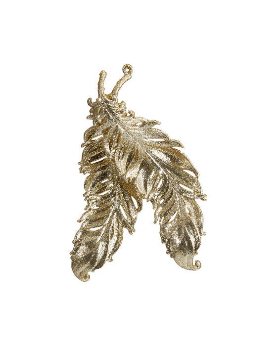 Denna vackra julgransdekoration i form av två guldglittrande fjädrar kommer att ge din gran en elegant och glittrande touch. Med sin skimrande yta och detaljerade design reflekterar den ljuset och skapar en härlig julkänsla i ditt hem.