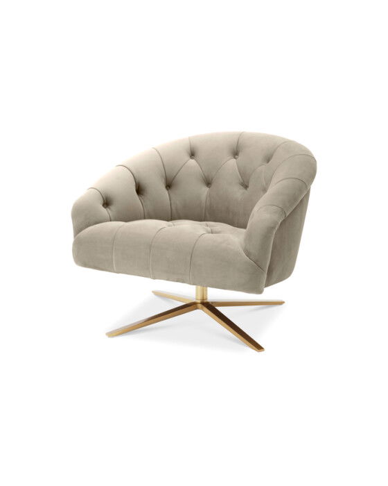 Den eleganta Gardner fåtöljen i borstad mässing och grå-beige sammet är en perfekt balans mellan stil och komfort. Med stoppning av skum i både sitts och rygg är den inte bara vacker att se på, utan även bekväm att använda för långa stunder.