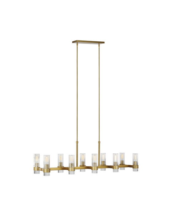 Geneva takkrona i mässing från Visual Comfort har en modern och sofistikerad design med en varm finish. Med sina eleganta, ribbade glasskärmar skapar denna ljuskrona en lyxig känsla och passar perfekt i matsalar, vardagsrum eller entréer.