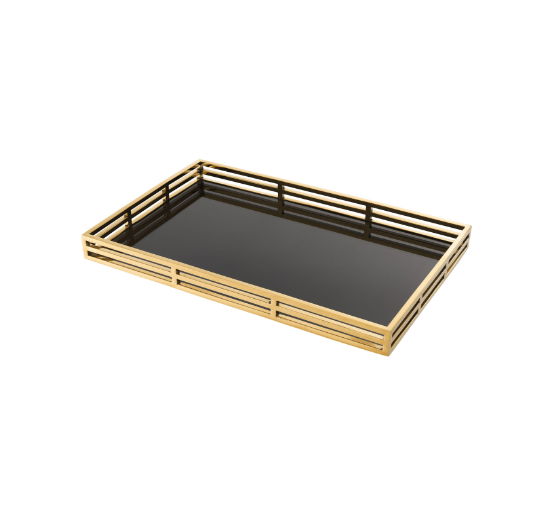 Giacomo bricka är en elegant och exklusiv rektangulär serveringsbricka i svart spegelglas tillverkad av rostfritt stål. Den fungerar även utmärkt som dekoration och kan användas för att ställa vacker dekor, bordslampa eller ljusstakar på. Finns även i svart.