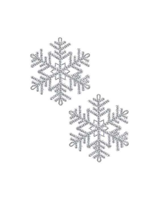 Skapa en magisk julkänsla med dessa eleganta snöflingor i glittrande silver till din julgran. Dessa vackra snöflingor glimmar fint i granen och skapar en stämningsfull atmosfär. Varje set innehåller två stycken snöflingor, perfekta för att komplettera din julgransdekoration.