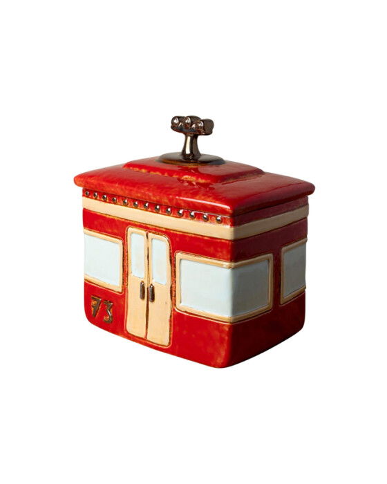 Fantasifull förvaringsdetalj som för tankarna till bergslandskap, linbanor och retrofuturistisk design. Denna ask är tillverkad i stengods med ett glansigt ytskikt som framhäver de detaljrika konturerna. Fungerar perfekt för förvaring av småsaker som te, smycken eller nycklar – eller som rent dekorativt objekt i köket, hallen eller barnrummet. En charmig inredningsdetalj som kombinerar nostalgi med karaktär.