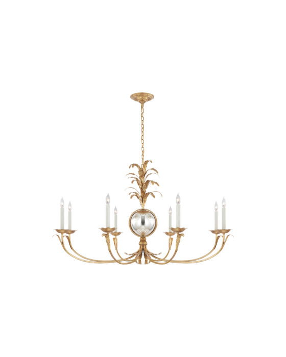 Gramercy Grande Wide Chandelier från Visual Comfort är en imponerande ljuskrona i förgylld järn som kombinerar klassisk elegans med en touch av glamour. De graciöst böjda armarna och de dekorativa detaljerna ger en sofistikerad känsla, medan den centrala speglande kulan tillför en modern twist. Perfekt för att skapa en lyxig atmosfär i matsalar, vardagsrum eller stora entréer.