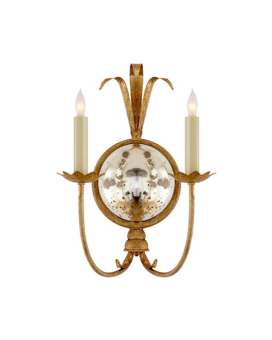 Gramercy vägglampa dubbel gilded iron från Visual Comfort är en elegant vägglampa i förgylld järn som utstrålar tidlös charm och sofistikation. De två ljushållarna med dekorativa detaljer ramas in av en antikbehandlad spegel som reflekterar ljuset och skapar en varm, inbjudande atmosfär. Perfekt för att addera en touch av lyx i hallen, vardagsrummet eller matsalen.
