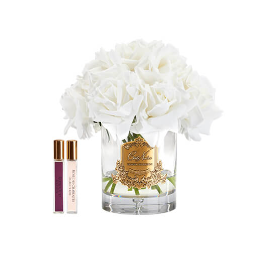 Grand Bouquet är ett exklusivt set med en dekorativ blombukett som du sprayar med medföljande rumsparfym. Den frodiga buketten består av vita rosor av högkvalitativt konstmaterial i en glasvas med majestätiskt emblem. Genom att applicera doften på blommans blad får du en bukett och diffuser i ett. Grand Bouquet ingår i vår serie exklusiva konstblommor och dofter från Côte Noire.