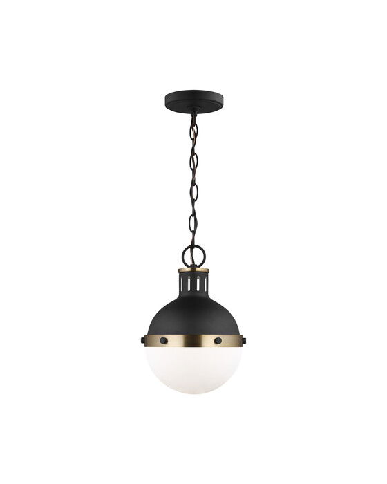 Visual Comforts Hanks takpendel svart har en stilren och industriell design med en rund opalglasskärm och detaljer i metall. Den finns i färgerna Midnight Black, Brushed Nickel och Satin Brass och är perfekt som accentbelysning över köksöar, i hallar eller som en elegant detalj i mindre utrymmen.