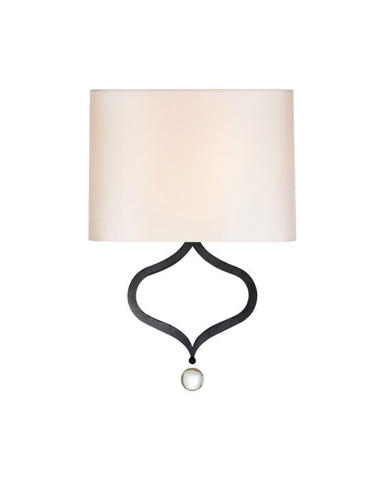 Heart vägglampa i svart färg, designad av Visual Comfort. Denna eleganta lampa har en åldrad järnfinish och en naturlig percale-skärm som sprider ett mjukt och behagligt ljus i rummet.
