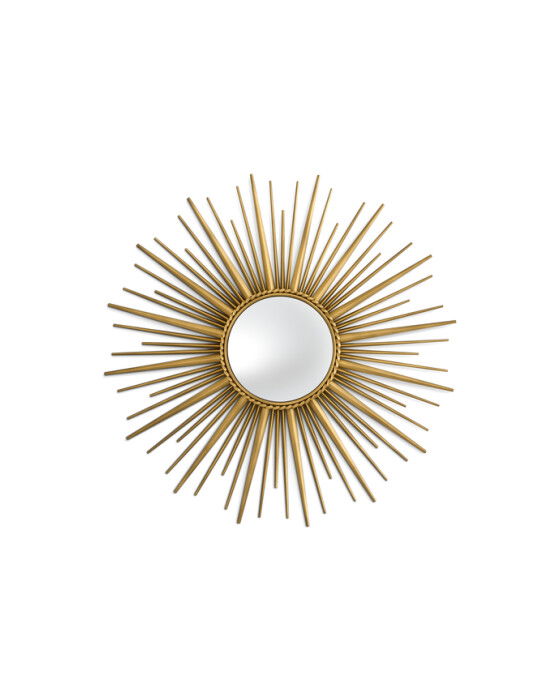 Helios spegel i vintage brass är en vacker solspegel som passar perfekt i både hallen och vardagsrummet. Med en diameter på 96 cm blir den en imponerande och praktisk dekoration i ditt hem.