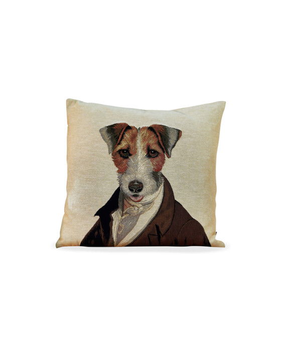 Skapa en charmig och sofistikerad atmosfär i ditt hem med denna exklusiva gobelängkudde från Newport. Kudden pryds av ett detaljrikt porträtt av en stilfull Jack Russell Terrier i kostym och kravatt, vilket ger den en tidlös elegans med en humoristisk touch.