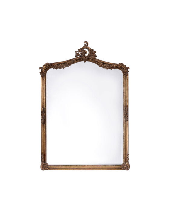 Henri är en vacker spegel i guld med en naturlig slitning i antik stil som är tillverkad efter äldre traditionell hantverkskonst. Varje spegel har ett unikt utseende med naturliga sprickningar och färgskiftningar. Med en röd underton under bladguldet och en matt gröntonad lack ger den en perfekt antik look inspirerad av det vackra slottet Le château du Nouvion-en-Thiérache där Henri, Greven av Paris, föddes.
