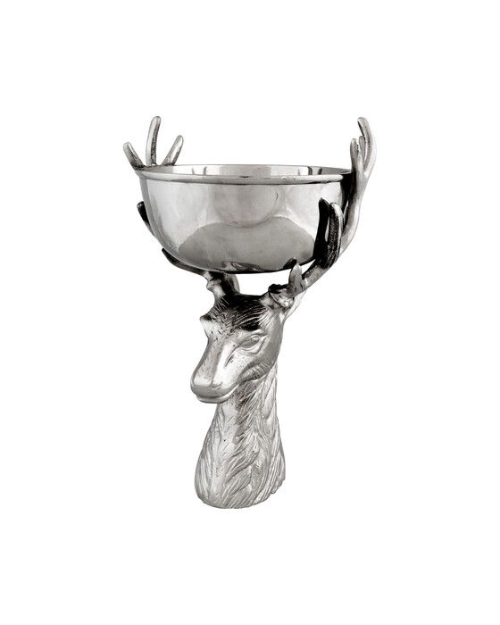 Denna imponerande vinkylare med skulpturala hjortmotiv är ett serveringsföremål utöver det vanliga. Den blanka skålen lyfts upp av hjorthorn, vilket skapar en dramatisk och naturinspirerad silhuett, perfekt för att sätta en storslagen prägel vid högtidliga tillfällen och festliga tillställningar.