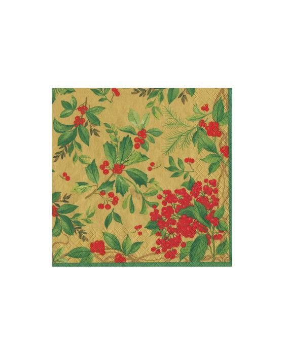 Dessa festliga pappersservetter har en elegant guldig botten och ett klassiskt julmotiv av järnek med gröna blad och röda bär. Perfekta för att ge ditt julbord en tidlös och stämningsfull känsla, samtidigt som de är praktiska för alla julens måltider. Servetterna kombinerar både stil och funktion.