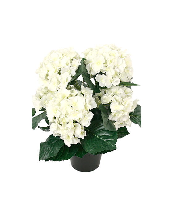 Den konstgjorda hortensia krukväxten i vit färg är en perfekt inredningsdetalj som alltid är i blom. Med hög kvalitet och naturtrogen känsla skapar den en botanisk atmosfär i rummet. Ytterkruka ingår ej.