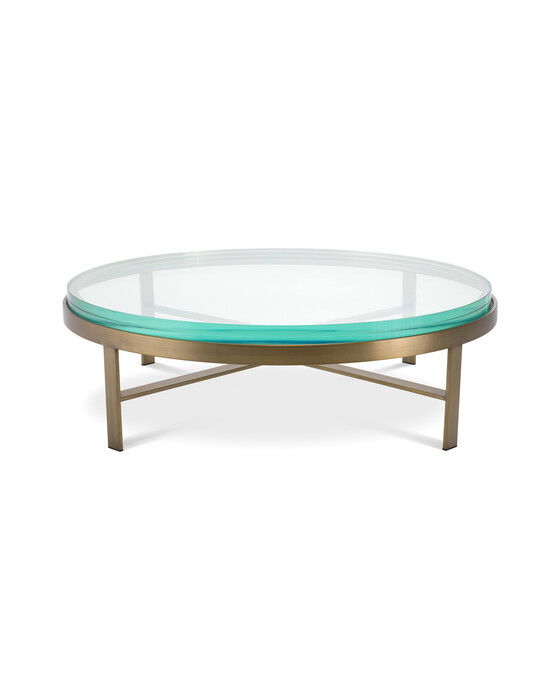 Hoxton är ett stilrent soffbord med rena linjer tillverkat av rostfritt stål med en elegant borstad mässingfinish. Den kraftiga runda bordsskivan i glas ger bordet en unik och iögonfallande look.