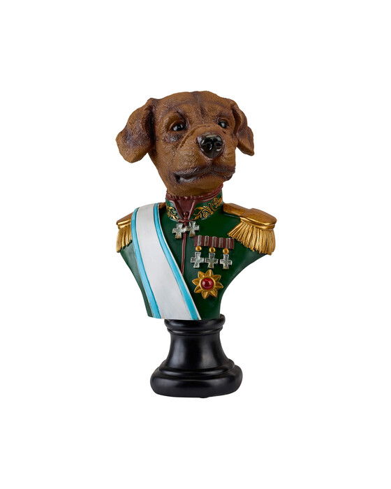 En elegant skulptur av en boxer hund klädd i militäruniform med detaljer, medaljer och band. Perfekt för att addera elegans och lekfullhet i ditt hem eller som en unik gåva.