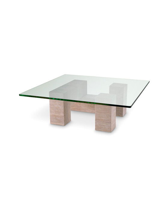 Ikal soffbord är en elegant och stilren möbel som kommer att förvandla ditt hem. Det rektangulära soffbordet har en bordsskiva i klarglas och en asymmetrisk bas i travertin, vilket ger det en modern touch.