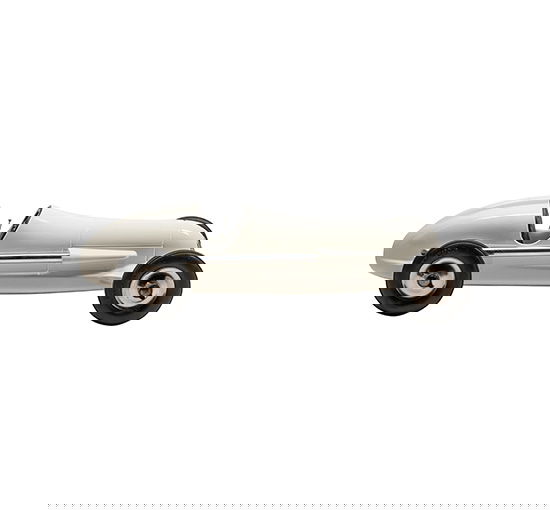 Denna stilfulla miniatyrmodell av en vit skrivbordsracer representerar romantiken och dramatiken hos de mest kända Grand Prix-racerna någonsin.
