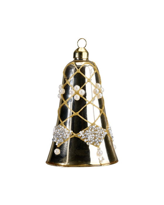 Denna eleganta julklocka i guld är en vacker prydnad för julgranen. Med pärlbeströdda detaljer, harlequin mönster och blanka yta, reflekterar klockan ljus och skapar en glittrande effekt. Perfekt för att ge juldekorationen en klassisk och lyxig touch, samtidigt som den bidrar till en varm och festlig atmosfär i hemmet.