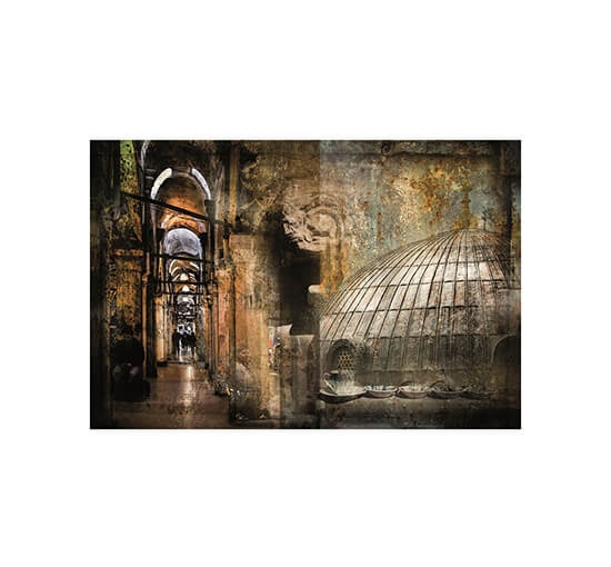 Tavlan ”Istanbul” från Cobra Art fångar stadens historiska arkitektur och mystiska atmosfär i ett stämningsfullt collage. De jordnära tonerna och patinerade texturerna skapar en känsla av tidlöshet, medan den imponerande kupolen och de karaktäristiska valvgångarna påminner om Istanbuls rika kulturarv.