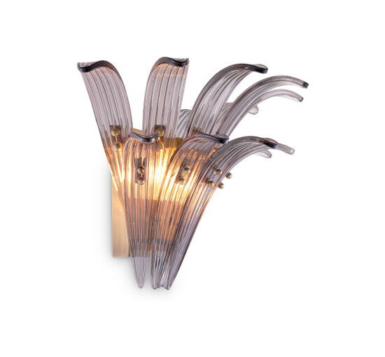 Inspired by nature, Wall Lamp Italo creates a display of energetic brilliance and shadows. The luminaire has a light brushed brass finish and two rows of ribbed smoked glass decorations, reminiscent of leaves, giving the impression of a tropical treetop. Vägglampan är avsedd för fast installation och måste kopplas direkt till en elsladd som dras från väggen. Kabeln på lampan sitter bakom väggplattan och kommer inte vara synlig efter att lampan fästs på väggen.