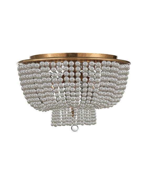 Eleganta belysningsalternativ som kombinerar 1920-talsstil med modern enkelhet. Jacqueline plafond erbjuder en dramatisk känsla med pärlor som draperas elegant från en ram i antik mässing och klarglas.
