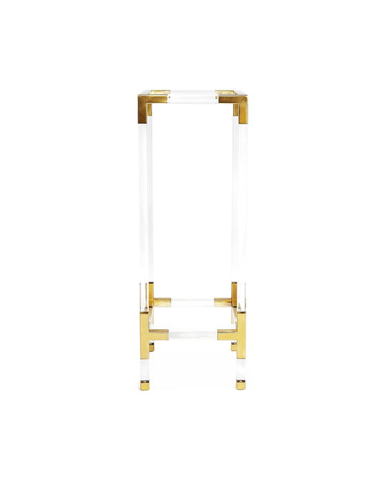Jacques är en piedestal med den perfekta blandningen av enkelhet och glamour, modernt och traditionellt. Piedestalen är tillverkad av lyxig klar akryl med detaljer av borstad mässing. Jacques är försedd med en låg glashylla som är perfekt att placera böcker eller mindre inredning på. Placera en vas eller en dekoration på piedestalen, sätt den i ett hörn i rummet eller framför ett fönster och se magin utvecklas.