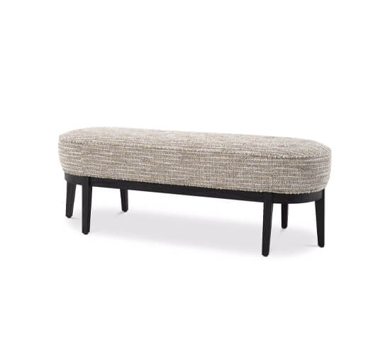 Om du gillar de organiska formerna som kännetecknar biofil design är bänken Jarrett något för dig. Bänken har en mjuk slät form med rundade hörn och blir ett elegant och praktiskt komplement till din hall, lounge, sovrum eller klädkammare. Sitsen är klädd i Mademoiselle beige och ramen med svart finish har tre istället för två ben på vardera sidan, vilket gör denna bänk till ett riktigt statement.