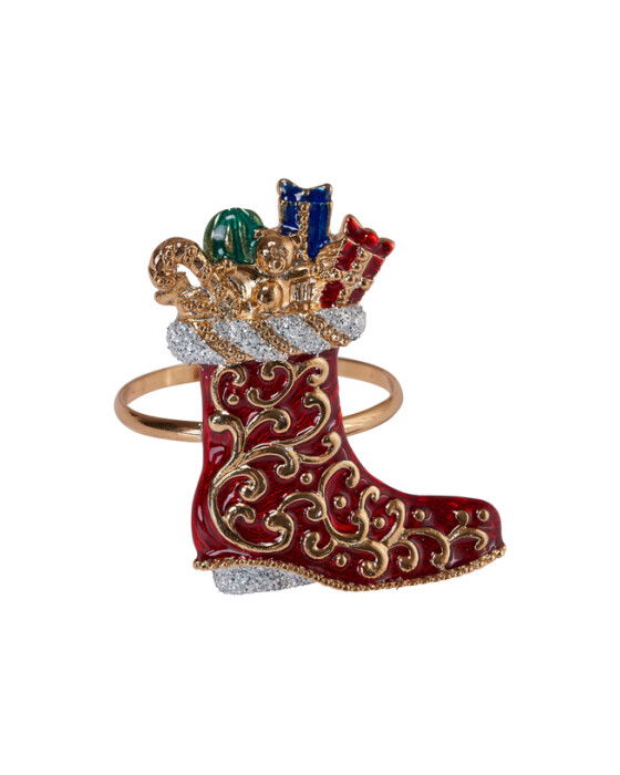 Skapa en magisk julstämning vid ditt bord med denna vackra servettring i form av en festlig julstövel. Den är dekorerad med gyllene detaljer och fylld med små presenter, vilket gör varje kuvert speciellt. Inspirerad av klassisk smyckeskonst och antika samlarobjekt, erbjuder den en tidlös elegans som förgyller din juldukning.