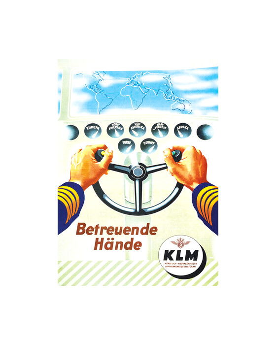 This stunning vintage KLM poster captures the elegance and reliability of mid-century aviation, featuring a pilot’s hands at the controls, guiding passengers across global destinations. The bold German phrase ”Betreuende Hände” translates to ”Caring Hands,” emphasizing KLM’s commitment to safety, precision, and exceptional service. Designed in a striking retro-futuristic style, this artwork reflects the optimism of the golden era of commercial aviation, where pilots were seen as trusted navigators of the skies. The poster includes an array of destinations such as Europe, North and South America, Africa, and major cities like Tokyo and Sydney, reinforcing KLM’s extensive international reach. Originally used as an advertising piece for KLM Royal Dutch Airlines, this poster is a true collector’s item for aviation enthusiasts, vintage travel lovers, and design aficionados.