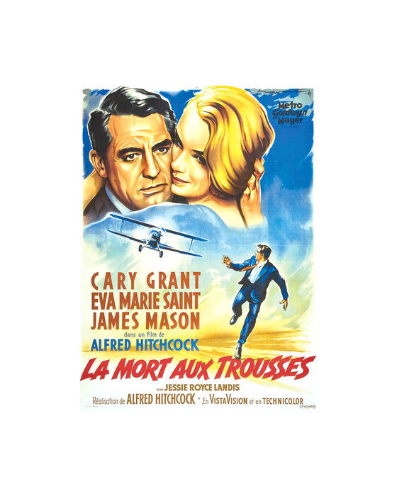 La Mort Aux Trousses är en tavla som hyllar Alfred Hitchcocks mästerverk ”North by Northwest” (på franska La Mort aux Trousses), med Cary Grant och Eva Marie Saint i huvudrollerna. Motivet fångar filmens spänning, romantik och action, med Cary Grants ikoniska flykt från ett attackplan i centrum av bildens dramatiska layout. De livfulla färgerna och tidstypiska typsnitten förmedlar filmens klassiska charm och spionthrillerns elegans. En perfekt inredningsdetalj för filmälskare och retroentusiaster.