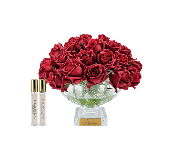 La Piece Maitresse är ett exklusivt set med en dekorativ blombukett som du sprayar med medföljande rumsparfym. Den frodiga buketten består av hela 37 röda rosor av högkvalitativt konstmaterial i glasvas och blir snabbt mittpunkten i rummet.